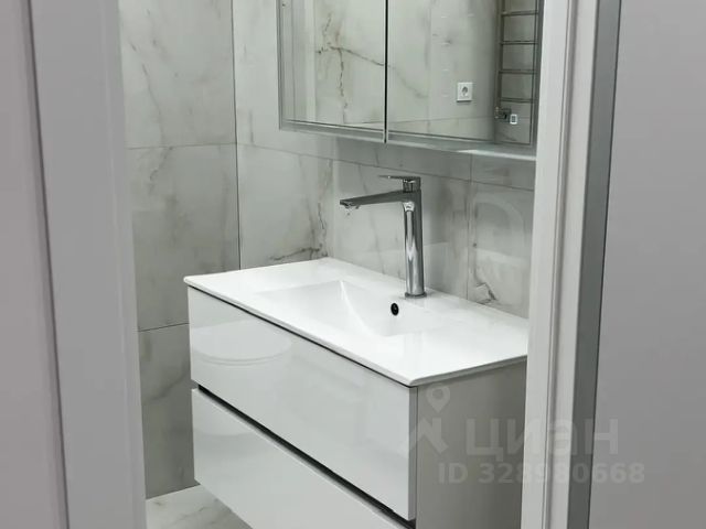 В ванной подвесной шкаф со встроенной раковиной, зеркальный шкаф с подсветкой, полотенцесушитель, стирально-сушильная машина Miele. Установлен водонагреватель. Ванна 170*70.