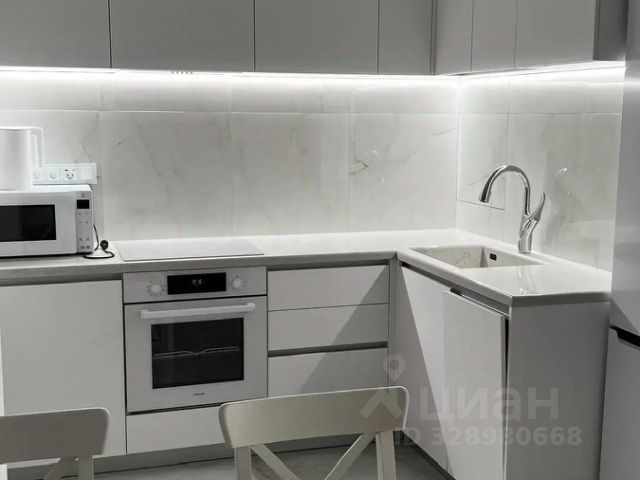 На кухне столешница выполнена из кварцевого камня, интегрированная мойка, смеситель для кухни Jacob Delafon с гибким изливом и функцией душа. Кухонная бытовая техника бренда Weissgauff (вытяжка, индукционная варочная панель, электрический духовой шкаф, посудомоечная машина 450 мм). Микроволновая печь LG, электрический чайник Xiaomi.