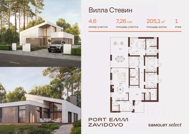В продаже вилла площадью 422,4 м2 на участке 17,89 соток от застройщика "Самолет" в загородном проекте PORT EMM ZAVIDOVO. Загородный курорт премиум-класса на берегу Волги в 1,5 часах от Москвы по трассе М-11. Также есть пристань для катеров и вертолетная площадка. Панорамная релакс-зона в гостиной со вторым светом, камином и выходом на уютную террасу прекрасное место для отдыха и вдохновения. Тектоничное и устойчивое формообразование, вдохновленное современной архитектурой, естественными материалами и переосмыслением стиля шале. Уютные балконы обеспечат дополнительное пространство для отдыха на природе с повышенным комфортом. Комфортная вилла с просторной кухней-гостиной, мастер-спальней, кабинетом, гардеробной и благоустроенным и огороженным просторным участком. На территории PORT EMM ZAVIDOVO расположены: - Отель Resort&SPA 5* - Спа, велнес центр, бассейн с подогревом - Яхт-клуб с центром проката - Благоустроенные пляжи и прогулочная набережная - Рестораны и кафе - Спортивный кластер - Игровые площадки - Школы детских видов спорта Покупка по 214-ФЗ по ДДУ, что гарантирует надежность и прозрачность сделки. Приглашаем Вас в офис продаж на презентацию проекта ежедневно с 09.00 до 21.00. Предварительная запись на визит по телефону.