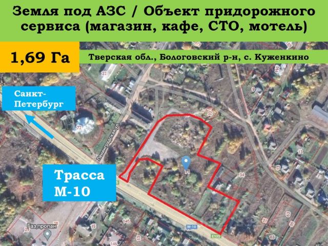 Участок 1,69 Га, примыкающей к трассе М10 Москва-Санкт-Петербург продаю. Назначение: под строительство АЗС, магазина, кафе, гостиницы, придорожной инфраструктуры Асфальтированный съезд с трассы. Находится непосредственно в с. Куженкино. Населенный пункт газафицирован. Планировка участка неровная. Есть асфальтированная площадка для обустройства стоянки. Идеально подходит для обустройства ресторанного комплекса, авто заправочного комплекса, придорожного комплекса обслуживания, гостиницы, хостелла и тп. Продажа от ИП. Все вопросы через сообщения.