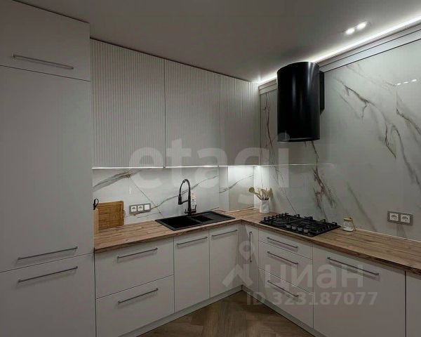 Кухня-гостиная: выполнена по индивидуальному заказу. Стена и фартук кухни отделаны широкоформатным керамогранитом от Кеrаmа Маrаzzi, три варианта освещения и подсветка