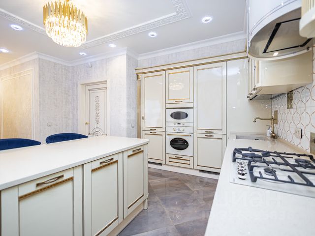 Встроенная кухня из натурального шпона и установлена качественная гарнитура. Столешница и стеновая панель выполнены из кварцевого камня.