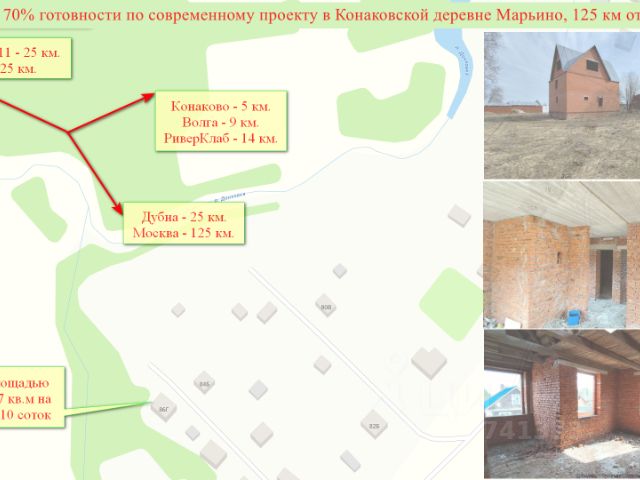 Недострой по выгодной цене - Ваш будущий дом или инвестиция! 125 км. от МКАД и экология Конаковского района, дер. Марьино - красивые места, живая природа и шаговая доступность до реки и леса, хорошая связь с курортами КонаковоРиверКлаб и б.Завидово, в 5 км. от Конаково продается незавершенный строительством (70% готовности) жилой дом в трех уровнях планируемой площадью 200 кв.м на участке ИЖС 10 соток. Электричество по границе участка, газ заведен на улицу. Дом - капитальное кирпичное строение площадью застройки 87,7 кв.м. Первый этаж предназначен для размещения гаража, котельной, кухни-столовой, санузла; полы бетонная подготовка; потолок - бетонные плиты перекрытия. Второй этаж - 3 спальни и санузел; полы бетонная подготовка; потолок - деревянные перекрытия. Третий этаж - помещение свободного назначения под спортзал или спа. Участок из земель населенных пунктов для строительства жилого дома 10 соток. Выровнен, сухой, имеет правильную форму, расположен на окраине деревни - максимум простора и минимум соседей. Документы к сделке готовы, один взрослый собственник. Для желающих всего побольше - можно докупить два смежных участка по 10 соток с постройками из красного кирпича. Перспективный недострой в растущем районе прибыльная инвестиция в себя и свою семью!