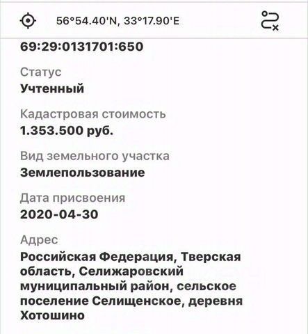 Земля с историей и большим будущим! Продаётся участок 10,6 га в живописной деревне Хотошино, Тверская область — уникальное место на месте древнего города Хачин, где легенды оживают среди природы. Экология и природа: кристально чистый воздух, рядом река и озеро, тишина и зелёные просторы. Идеально для загородных домов, экофермы или клуба отдыха. Инвестиционный потенциал: участок позволяет размежевать на 80 участков, что даёт возможность заработать до x8 от вложений! Подходит для создания коттеджного посёлка, туристической базы или усадебного комплекса. Удобный подъезд, электричество поблизости, развитое окружение. Документы готовы. Один собственник. Хотошино — место силы и возможностей: земля, где прошлое встречает будущее! Звоните прямо сейчас — подобные участки появляются раз в поколение!