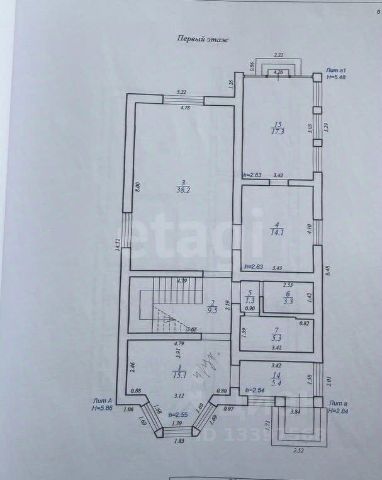 На 1 этаже: веранда с крыльцом 18 м2, прихожая 13,4 м2, жилая комната 18,3 м2, совмещенный санузел 5 м2, кухня-гостиная 25 м2, спальня 18 м2. Общая площадь первого этажа 80 м2.