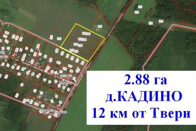 Тверская область, Калининский муниципальный округ, д. Кадино. 2.88 га земли сельскохозяйственного назначения для сельскохозяйственного производства. Кадастровый номер 69:10:0000009:568 571 По ПЗЗ - Зона СХ2 (сельскохозяйственное производство). Правильной формы 160*180 м на возвышенности. Граничит с деревней, с асфальтированной дорогой, землями с/х Асфальтированный круглогодичный подъезд. Электричество - линия 0.4 кв вдоль участка. Газ высокого давления по краю участка. 12 км западнее Твери по М10. 190 км от МКАД по М10 Трасса М11 в 300 м, съезд в Медном. 500 км от КАД От трассы М 10 - 2 км Форма, рельеф, наличие отличного подъезда, коммуникаций (свет, газ), близость к городу и к федеральным трассам, позволяет создать логистический комплекс по складированию, переработки и дальнейшей реализации с/х продукции или др с/х производства, фермерство. В собственности одного лица. В 1 км в д. Мермерины находится школа, детский сад, магазины. Ежедневное автобусное сообщение с Тверью. Маршрут 117. Водоем р Тверца 3 км, р Тьма 8 км , р Волга 15км Лес 200 м.