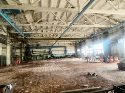 - Производственно-складское здание общей площадью 4300 м². Высота 12 м, полы ровные бетон (нагрузка 10 т/м²), частично антипыль. Два пролета шириной 24 м, длиной 90 м. Въездные ворота на нулевом уровне с возможностью въезда внутрь цеха. Установлены подкрановые пути для размещения кран-балок грузоподъемностью 20 т.