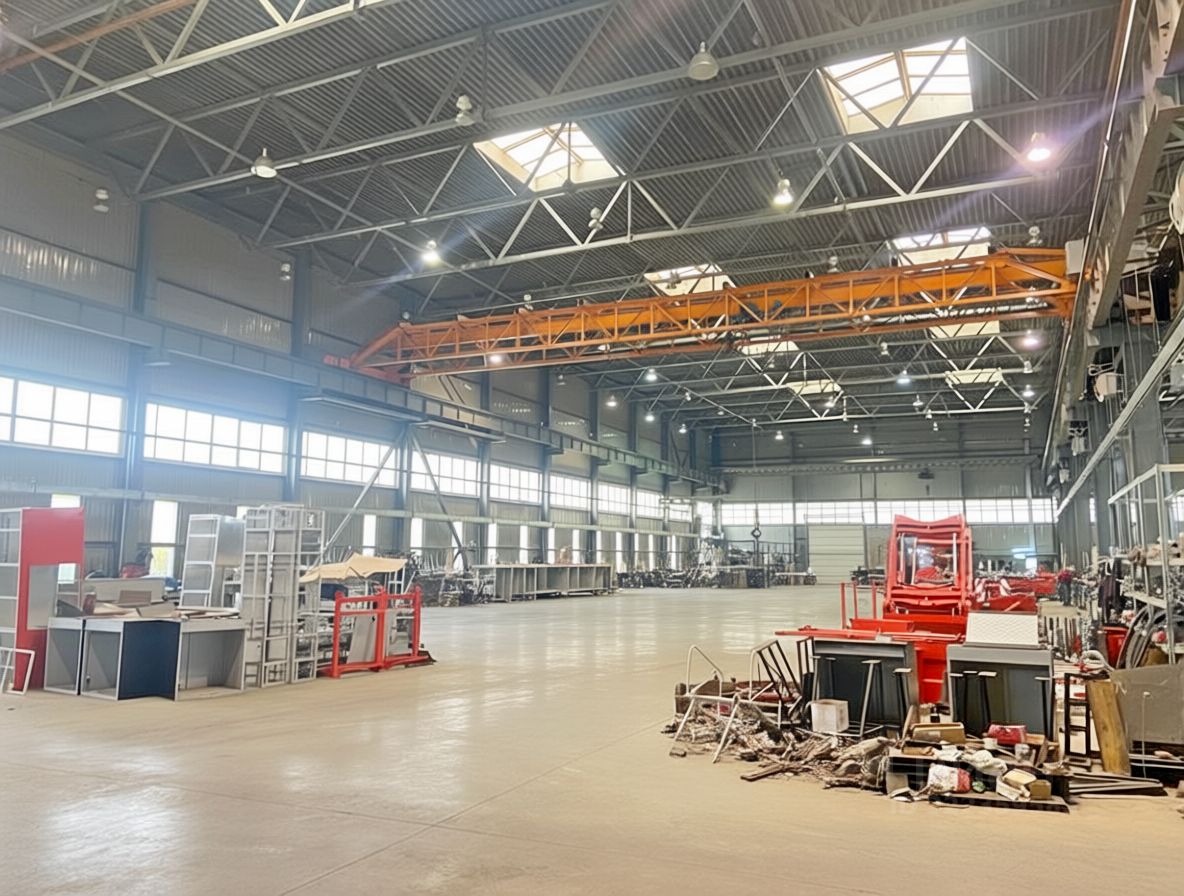 - Производственно-складское здание общей площадью 13 000 м². Длина пролетов 71 м. Высота 9 м, полы ровные (бетон, чугунная плитка). Несколько въездных ворот на нулевом уровне с возможностью въезда внутрь (в цех заходит ж/д ветка). Пролеты оборудованы кран-балками грузоподъемностью от 1 до 5т. Подведена газовая труба 76 мм среднего давления на покрасочные камеры.