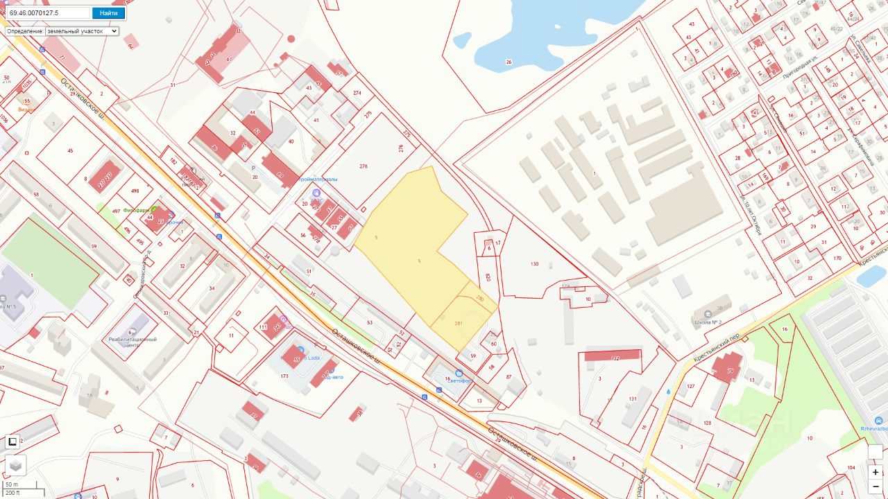 Земельный участок с кадастровым номером 69:46:0070127:5 площадь 20886 по адресу Тверская область, муниципальный округ Ржевский, город Ржев, шоссе Осташковское