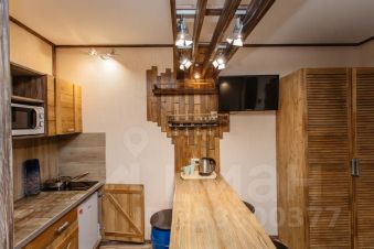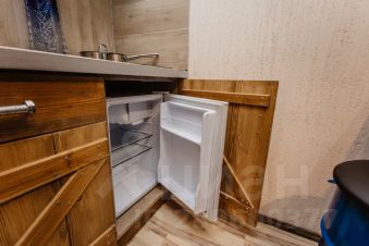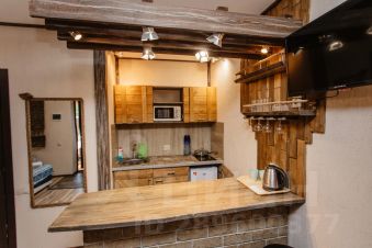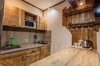 Кухня с индукционнои плитои, холодильником, электрическим чаиником, микроволновкои, обеденнои зонои