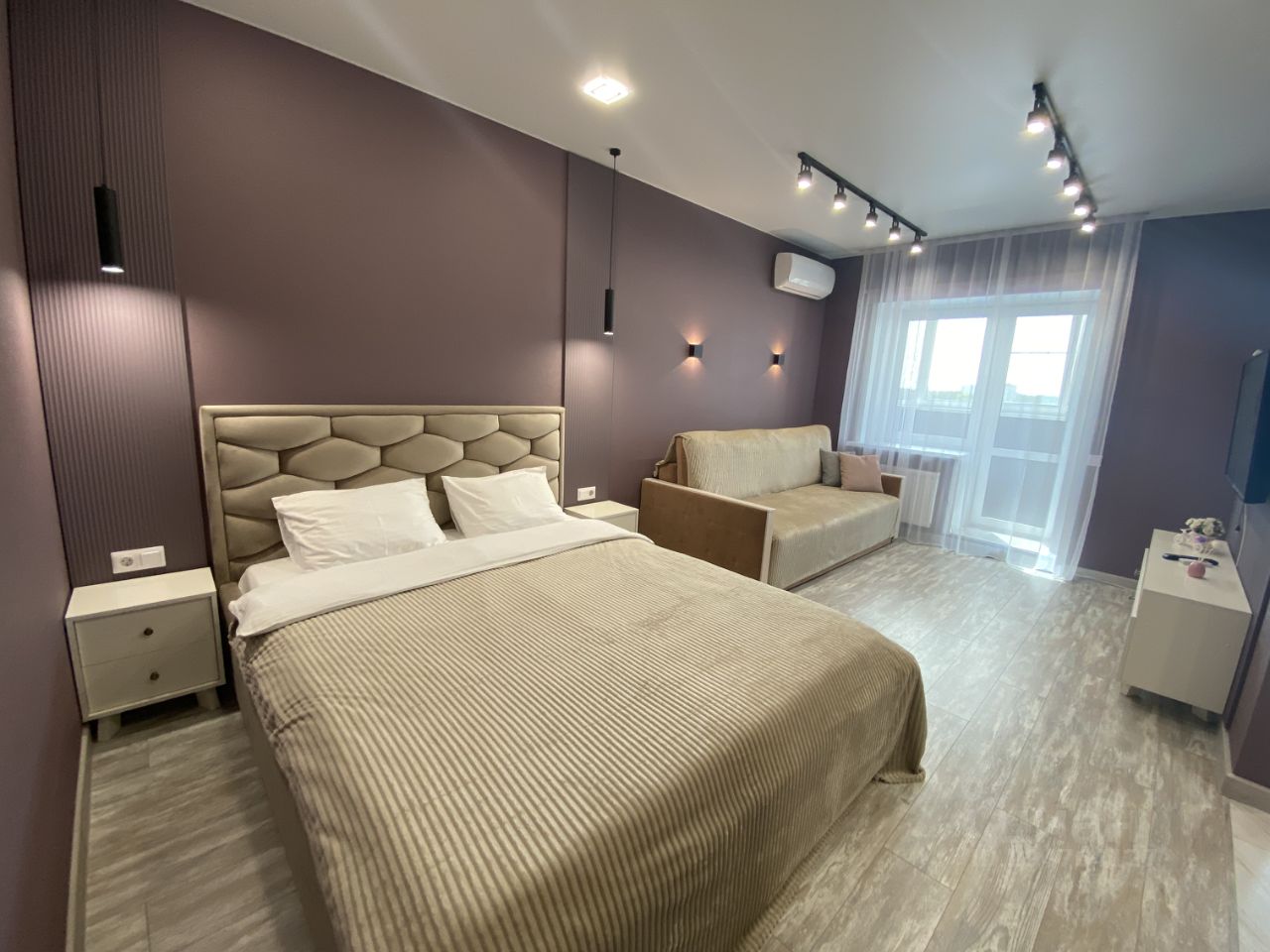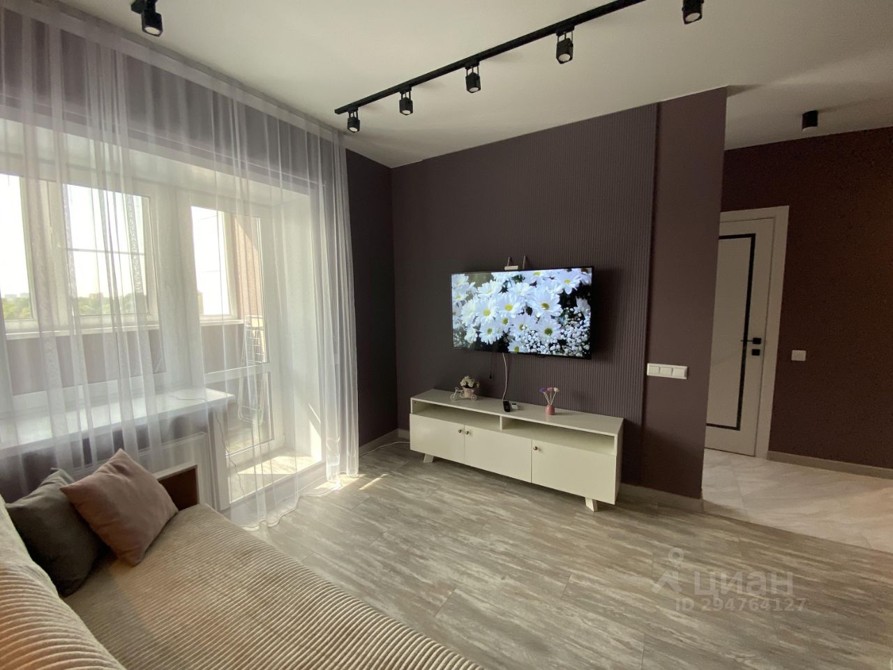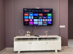 - уютная зона отдыха с мягкой мебелью, перед которой висит современный телеви-зор