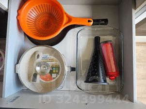 Холодильник, микроволновая печь и духовой шкаф с варочной поверхностью. А так же вся необходимая посуда.