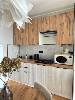 • Полностью оборудованная кухня: холодильник, плита, микроволновка, посуда, кастрюли, сковороды и кухонные принадлежности