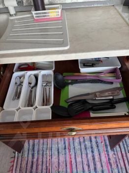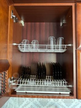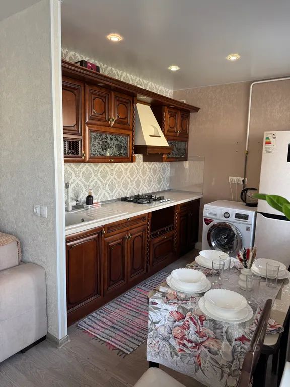 - Удобная обеденная и кухонная зона с набором посуды, плитой, микроволновой печью, холодильником, чайником