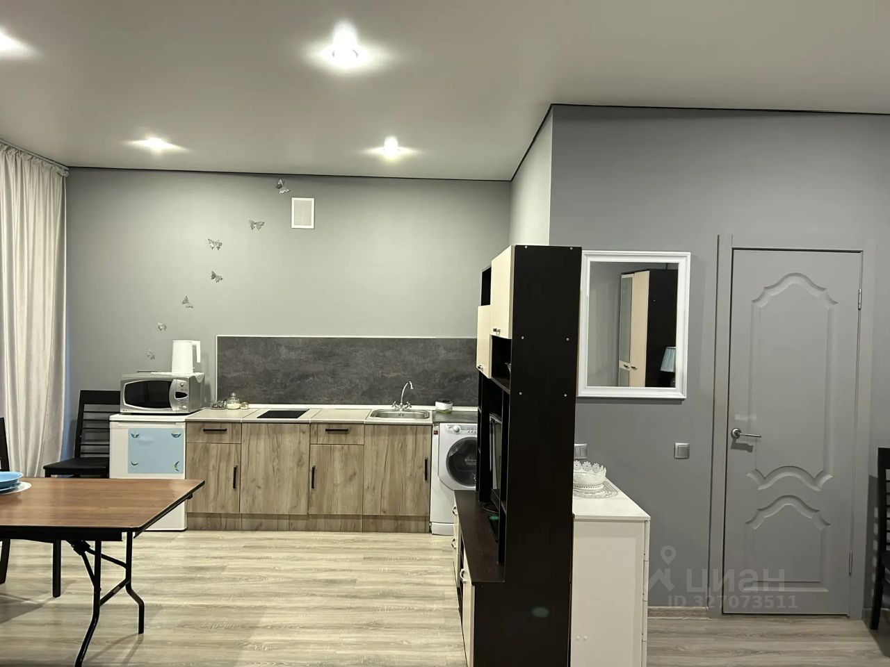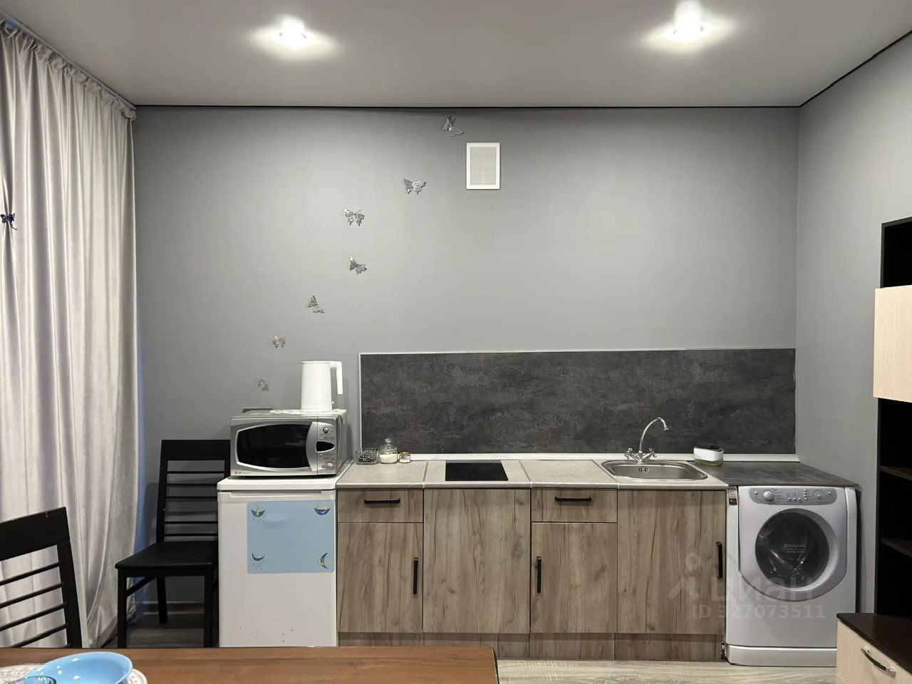 Есть всё для комфортного проживания: холодильник, электрическая варочная панель, микроволновая печь, чайник, обеденный стол, стиральная машина, раскладной диван, кресло, телевизор.