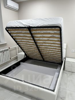 В спальной комнате кровать с подъемным механизмом, размер спального места 160*200, матрас Askona жесткий, 2 прикроватные тумбы, телевизор Samsung55