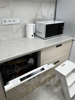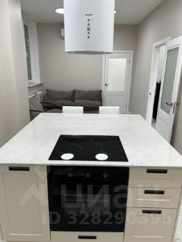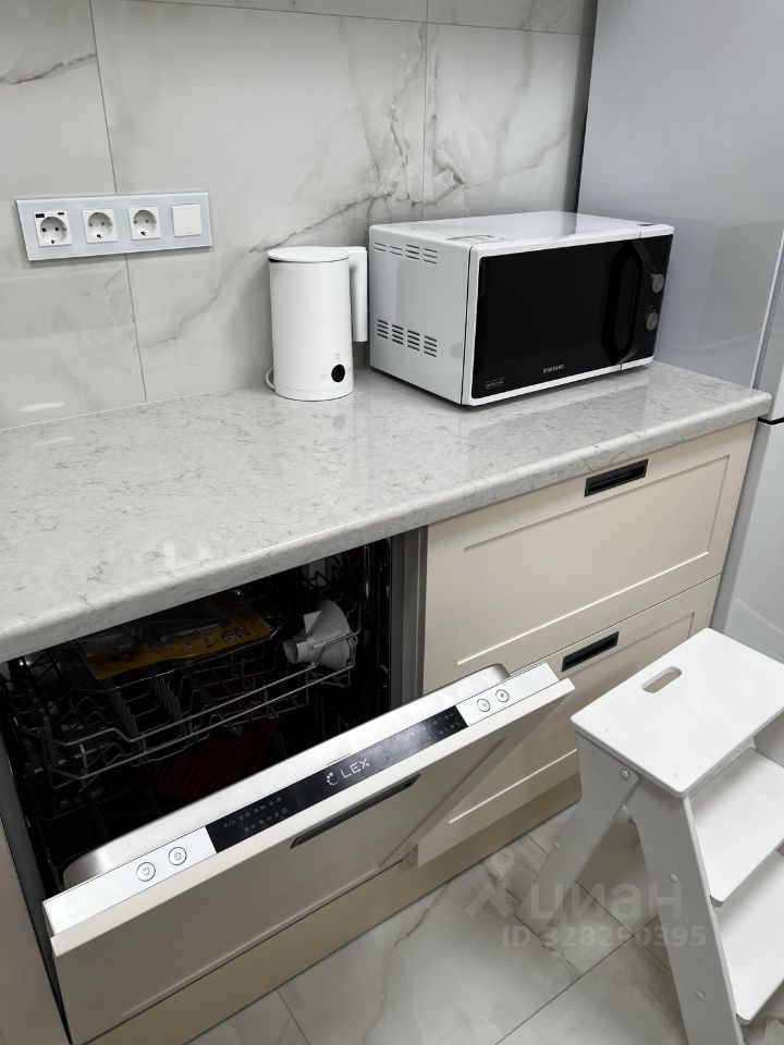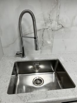На кухне столешница и остров выполнены из кварцевого камня, врезная мойка из нержавеющей стали японской торговой марки Omoikiri. Смеситель для кухни Lemark с гибким изливом и функцией душа. Кухонная бытовая техника бренда Weissgauff (вытяжка, электрическая плита, электрический духовой шкаф, посудомоечная машина 600 мм). электрический чайник, микроволновая печь. Высота рабочей поверхности 920 мм.
