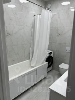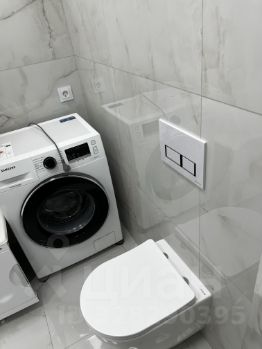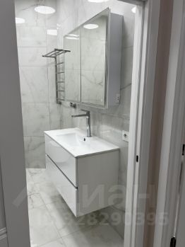 В ванной подвесной шкаф со встроенной раковиной, зеркальный шкаф с подсветкой, стиральная машина Samsung. Установлен водонагреватель, полотенцесушитель.