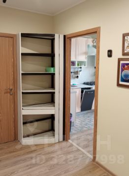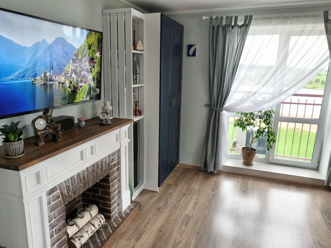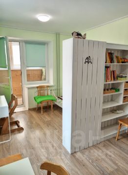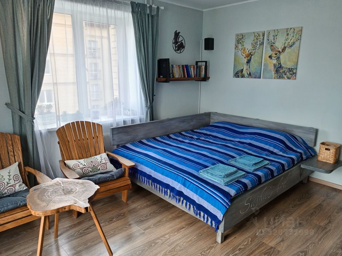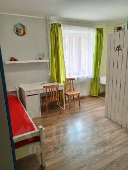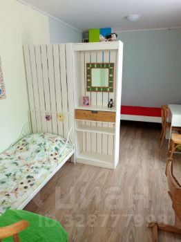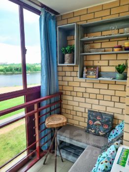 Спальня (детская): 2 одноместные кровати (80 см), письменные столы со стульями, 2 шкафа. Комната зонирована книжным шкафом, есть отдельное освещение. Из окна виден двор с детской площадкой и река. Дополнительный выход — на утеплённую лоджию, где можно организовать спальное место (раскладушка по запросу) или разместить гладильную доску и сушилку.