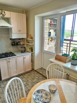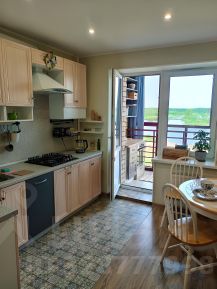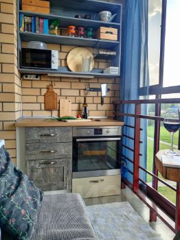 Кухня: газовая варочная панель, вытяжка, 3ступенчатая система фильтрации воды, большой холодильник, микроволновка, электрический чайник, вся необходимая посуда. Есть выход на остеклённую лоджию со столешницей и духовым шкафом — можно готовить на свежем воздухе. На лоджии также установлены мягкие скамейки для отдыха с видом на реку.