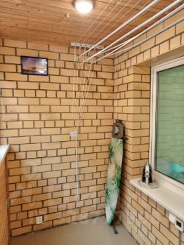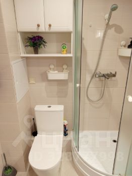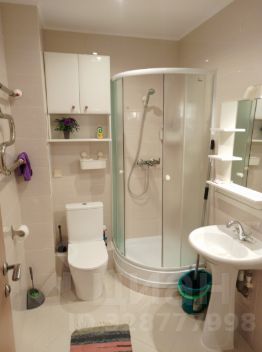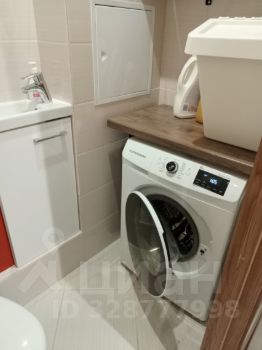 2 санузла: первый — совмещённый с душевой кабиной, раковиной, унитазом и полотенцесушителем; второй — со стиральной машиной, унитазом и небольшой раковиной.