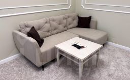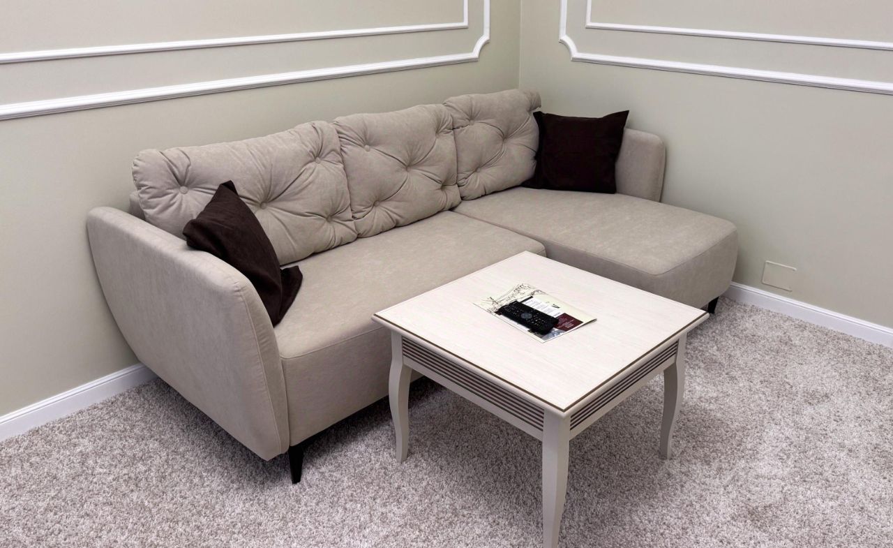 В гостиной комнате диван, кресло, мебельный гарнитур, комплекс посуды, журнальный стол, торшер, телевизор, телефон, кондиционер, мини-бар.