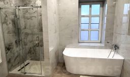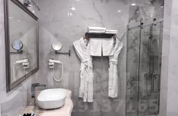 В санузле: душевая кабина с ванной, раковина, унитаз, набор туалетных принадлежностей, халаты, полотенца.