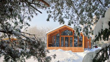 - Из панорамных окон — потрясающий вид на высокие сосны и ели