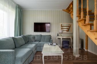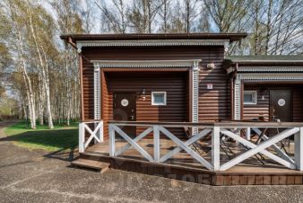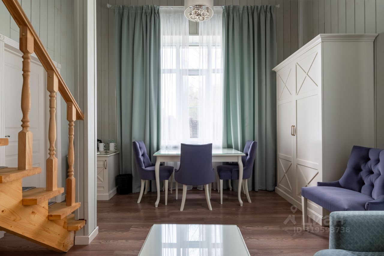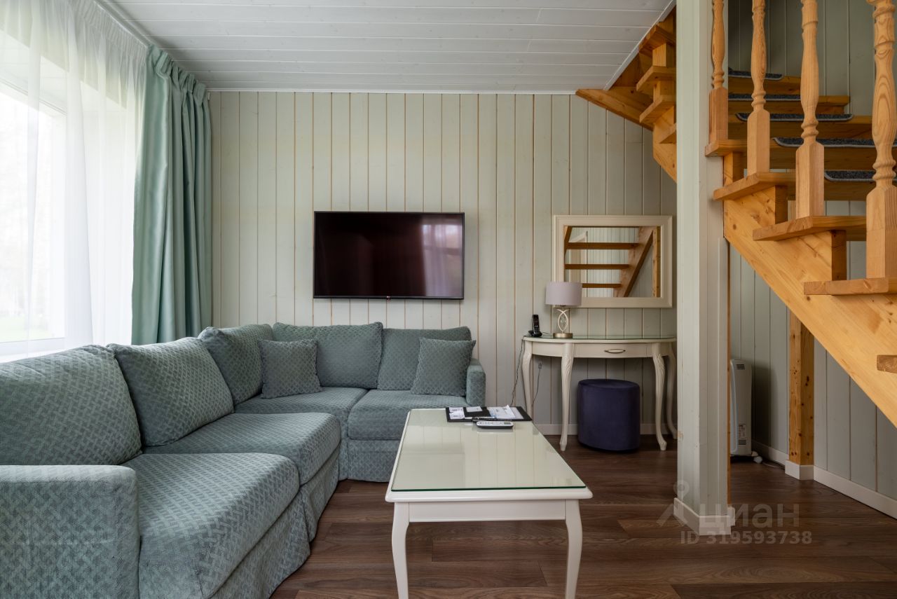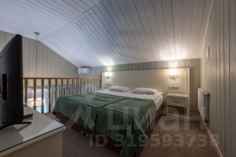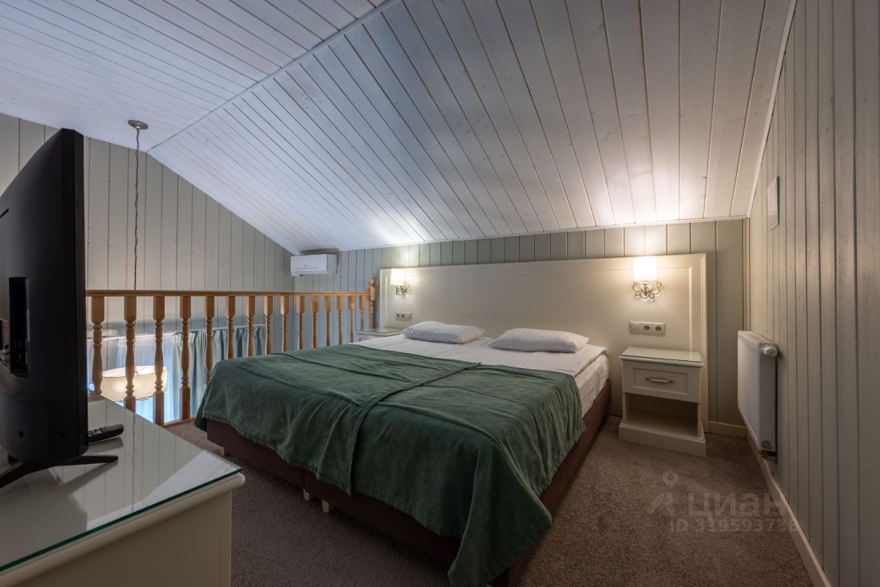 Номер выполнен в уютном загородном стиле, который прекрасно сочетается с природным окружением. Просторная гостиная с мягким диваном создает комфортную зону для отдыха. На втором этаже расположена спальная зона с широкой кроватью. Интерьер выполнен в светлых тонах, что придаёт пространству свежесть и лёгкость.