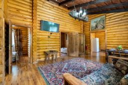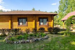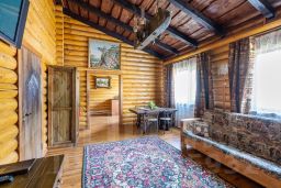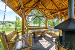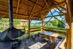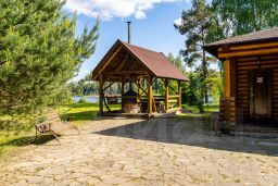 Дом с беседкой, общая площадь 65м2, из оцилиндрованного бревна, со всеми удобствами, состоящий из 2 спален, гостиной, кухни, санузла и веранды с видом на озеро( веранды нет). Вся мебель ручной работы, из массива дерева. Вид на озеро!