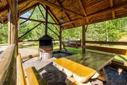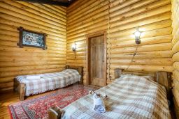 В одной спальне двуспальная кровать, в другой 2 односпальные кровати. В гостиной обеденная зона, и диван-кровать, имеется телевизор (20 каналов). Кухня оснащена холодильником, чайником, микроволновой печью, необходимой посудой. Горячая и холодная вода подается круглосуточно. У дома есть беседка, с мангалом и качелью.