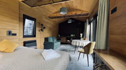 Восемь автономных барнхаусов расположены среди природы, каждый рассчитан на размещение двух гостей. Домики выполнены с акцентом на приватность и тишину: отдельная терраса, панорамные окна "от пола до потолка", вид на лес или реку. Архитектура и интерьер продуманы таким образом, чтобы гость чувствовал максимальный комфорт и уединение. Каждый дом имеет свою концепцию и посвящён выдающемуся лауреату Нобелевской премии. Внутри размещены тематические элементы: предметы, цитаты, книги, визуальные акценты, краткая легенда и "карта предметов" в доме. Это не просто проживание, а иммерсивный формат отдыха, где гость взаимодействует с историей и научным наследием конкретного учёного. Интерьеры выполнены в стиле современного минимализма: натуральное дерево, продуманное освещение, функциональная планировка. В каждом доме предусмотрено всё для автономного проживания: оборудованная кухня, качественная сантехника, система отопления, Wi-Fi, ортопедическое спальное место уровня премиум-класса.