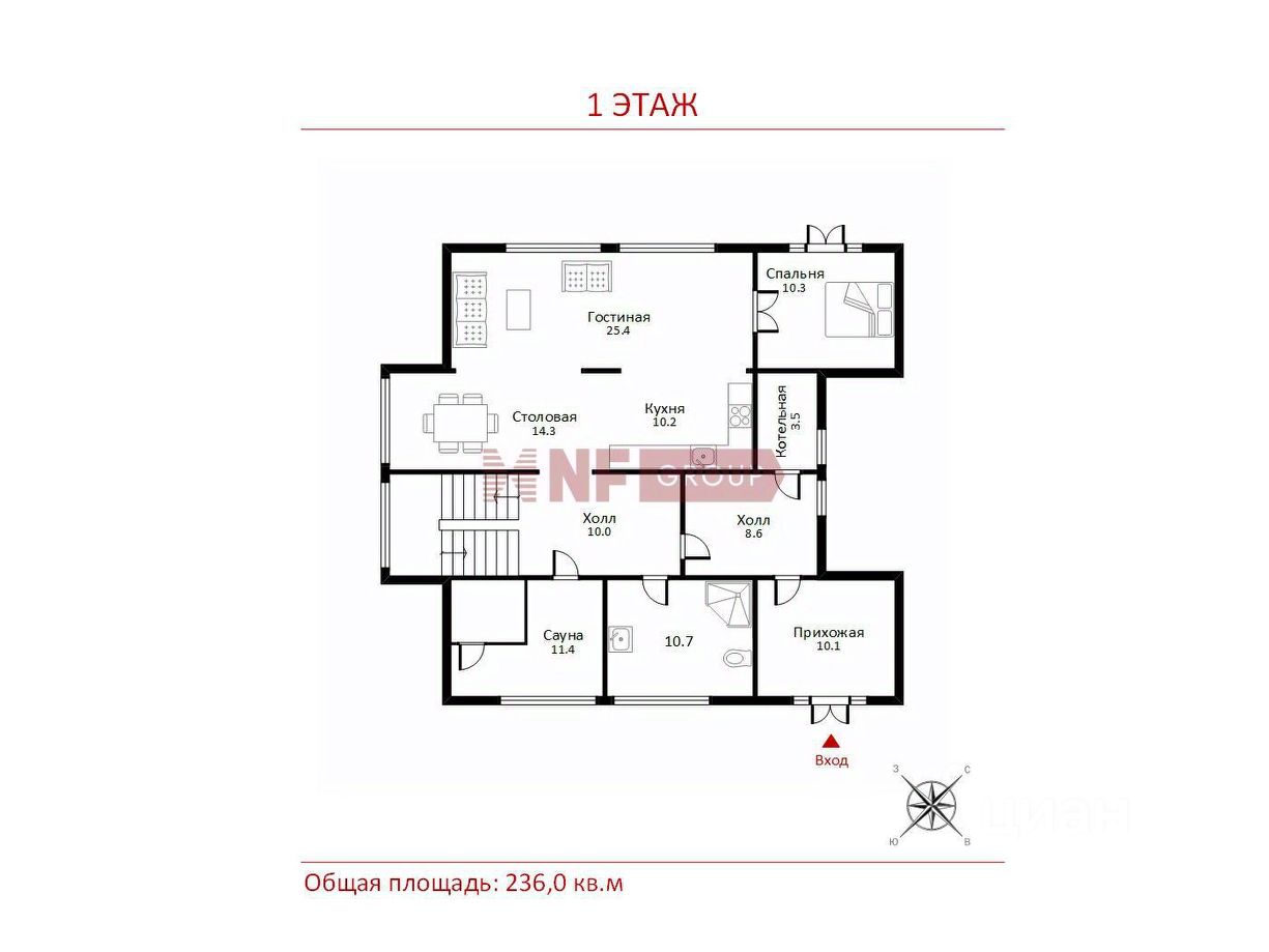 1 этаж: прихожая-гардеробная, холл, котельная, холл, с/у, сауна, кухня-столовая, гостиная, гостевая спальня;
