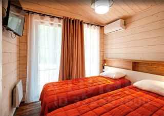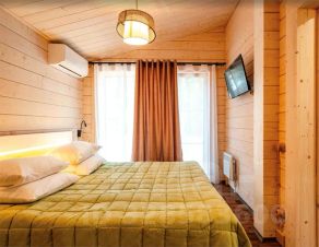 В шале предусмотрены две спальни. В одной спальне установлена двуспальная кровать, которую можно превратить в две раздельные односпальные для дополнительного удобства. В другой спальне — полноценная двуспальная кровать.