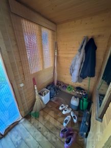 Уютный дачный дом с двумя спальнями, гостиной и санузлом внутри (горячая и холодная вода, полноценный туалет), водопровод реализован из колодца. В доме можно жить с ранней весны до поздней осени, т. к. он утеплён и имеет два вида отопления: электрические батареи под окнами и печку в гостиной