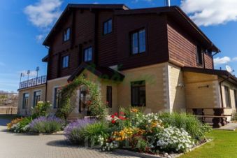 Дом площадью 1172 квадратных метра построен из оцилиндрованного бревна в 260 мм на монолитном фундаменте и находится на собственном участке в 25 соток. Цокольный этаж дома выполнен из железобетона и отделан декоративным камнем.