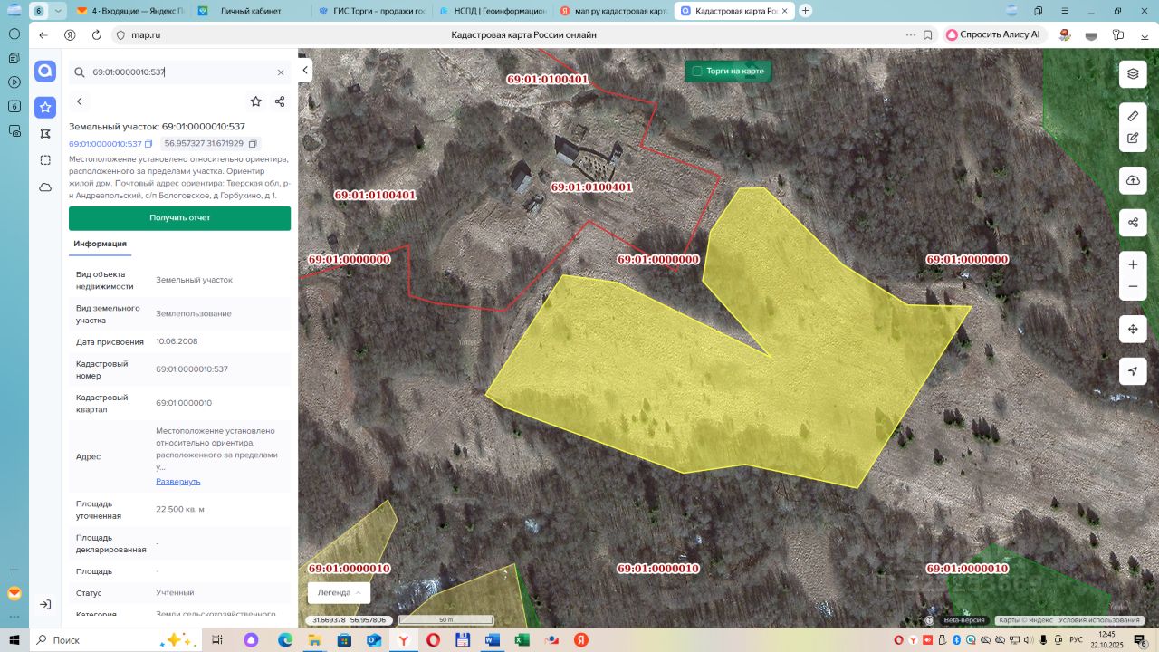 Земельный участок с кадастровым номером 69:01:0000010:537 площадь 22500 по адресу Тверская обл, р-н Андреапольский, с/п Бологовское, д Горбухино, д 1