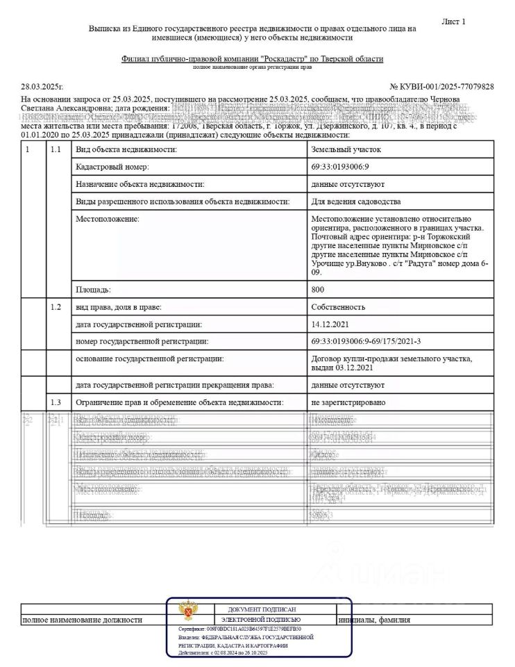 Земельный участок, кадастровый номер 69:33:0193006:9, площадью 800 кв.м., для ведения садоводства, адрес: р-н Торжокский Мирновское с/п Урочище ур. Внуково . c/т "Радуга" номер дома 6-09. Предоставление дополнительной информации об объектах продажи, обременении имущества, порядке проведения торгов, а также ознакомление с имуществом производится Организатором на основании заявления на ознакомление в свободной форме, направленного на электронную почту ###, тел.: ###. Заявления принимаются до окончания приёма заявок в рабочие дни с 11:00 до 16:00 (время московское).