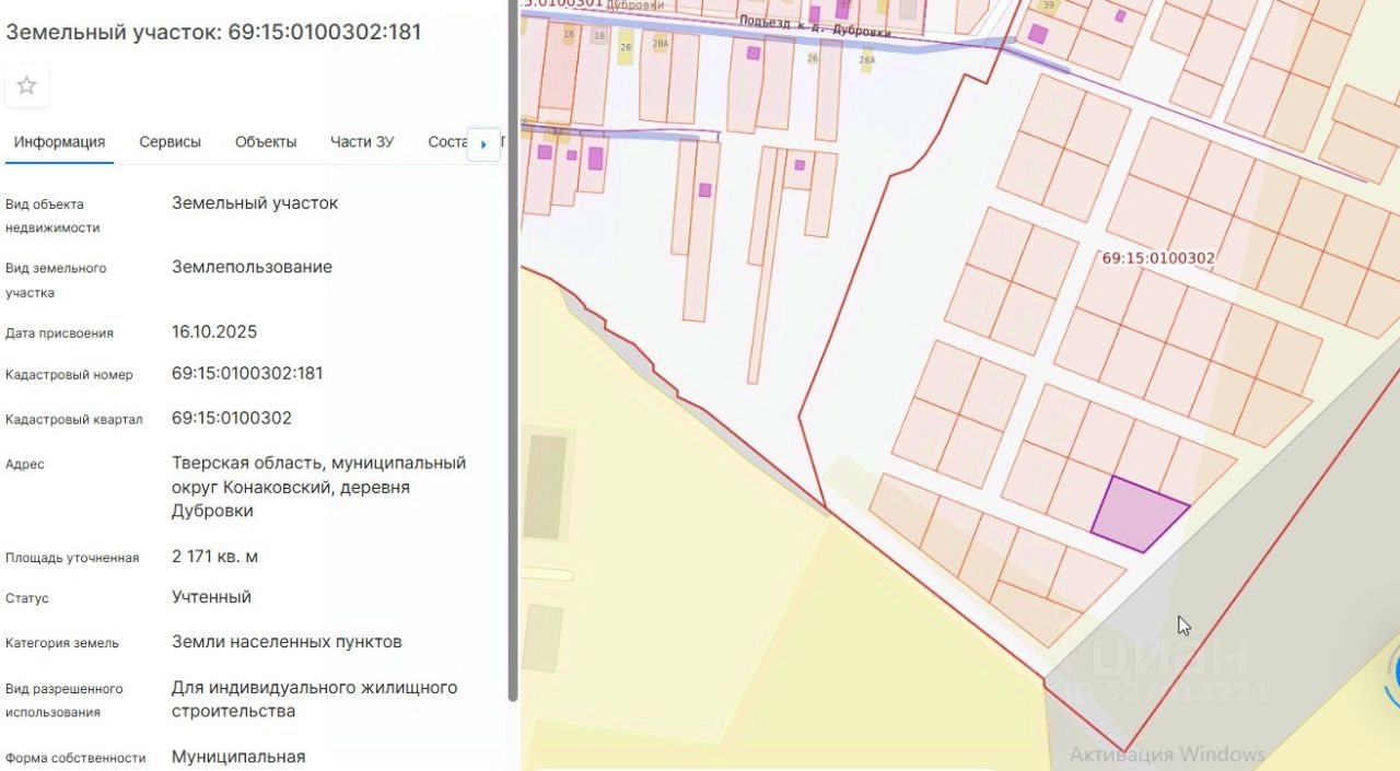 Земельный участок из земель населенных пунктов с кадастровым номером 69:15:0100302:181, площадью 2171 кв.м., по адресу: Тверская область, муниципальный округ Конаковский, деревня Дубровки, вид разрешенного использования: для индивидуального жилищного строительства.