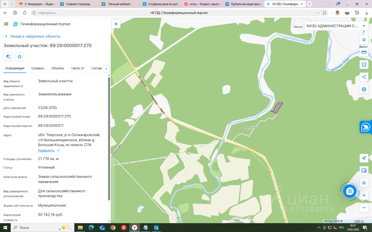 Земельный участок: кадастровый номер 69:29:0000017:270, площадью 21778 кв. м, категория земель: земли сельскохозяйственного назначения, вид разрешенного использования: для сельскохозяйственного производства, расположенный по адресу: Тверская область, Селижаровский р-н, вблизи д. Большая Коша, из земель СПК "Соколово", (далее Участок).