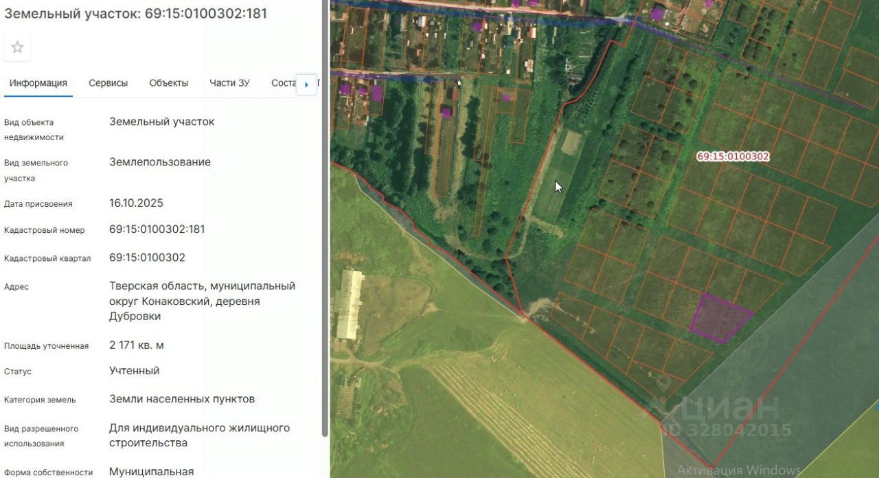 Земельный участок из земель населенных пунктов с кадастровым номером 69:15:0100302:181, площадью 2171 кв.м., по адресу: Тверская область, муниципальный округ Конаковский, деревня Дубровки, вид разрешенного использования: для индивидуального жилищного строительства.