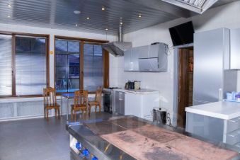 Кухня представляет собой помещение, укомплектованное профессиональным оборудованием: большими электроплитами, разделочными столами, холодильниками. Ресторан может одновременно разместить порядка 50 гостей.