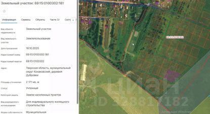 Земельный участок из земель населенных пунктов с кадастровым номером 69:15:0100302:181, площадью 2171 кв.м., по адресу: Тверская область, муниципальный округ Конаковский, деревня Дубровки, вид разрешенного использования: для индивидуального жилищного строительства.