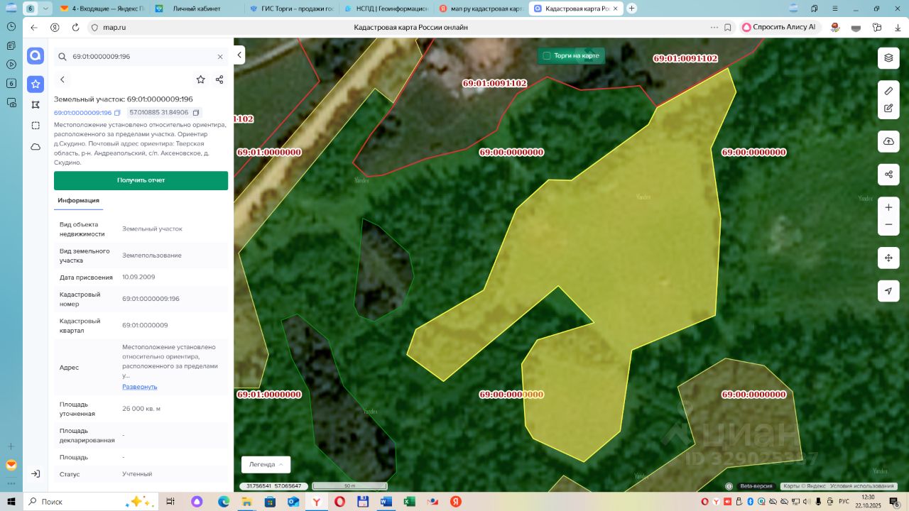 земельный участок с кадастровым номером 69:01:0000009:196, площадью 26000 кв.м. Местоположение установлено относительно ориентира, расположенного за пределами участка. Ориентир д.Скудино.Участок находится примерно в 720м, по напралению на юго-востокот ориентира. Почтовый адрес ориентира:Тверская область, Андреапольский р-н, с/п Аксеновское, д.Скудино. Категория земель - земли сельскохозяйственного назначения. Разрешенное использование земельного участка для ведения сельского хозяйства. Ограничение прав и обременение земельного участка: не зарегистрировано.