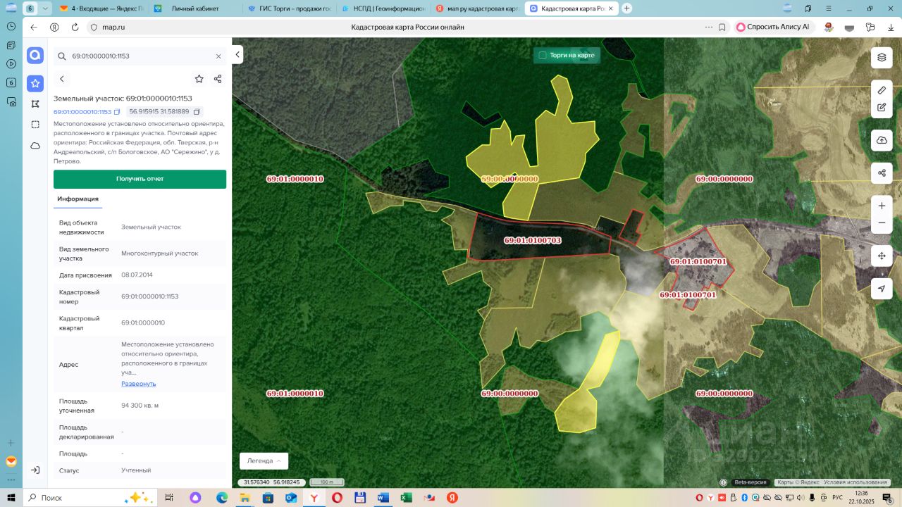земельный участок (многоконтурный состоит из двух контуров) с кадастровым номером 69:01:0000010:1153, площадью 94300 кв.м. Местоположение установлено относительно ориентира, расположенного в границах участка. Почтовый адрес ориентира:Тверская область, Андреапольский р-н, с/п Бологовское, АО "Сережино", у д.Петрово. Категория земель - земли сельскохозяйственного назначения. Разрешенное использование земельного участка для ведения сельского хозяйства. Ограничение прав и обременение земельного участка: не зарегистрировано.