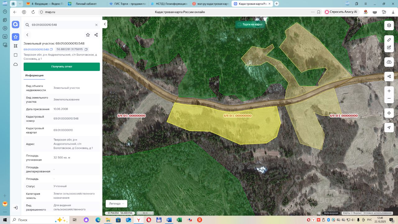 земельный участок с кадастровым номером 69:01:0000010:548, площадью 32500 кв.м. Местоположение : Тверская область, Андреапольский р-н, с/п Бологовское, д.Сосновец, д.1. Категория земель - земли сельскохозяйственного назначения. Разрешенное использование земельного участка для ведения сельскохозяйственного производства. Ограничение прав и обременение земельного участка: не зарегистрировано.