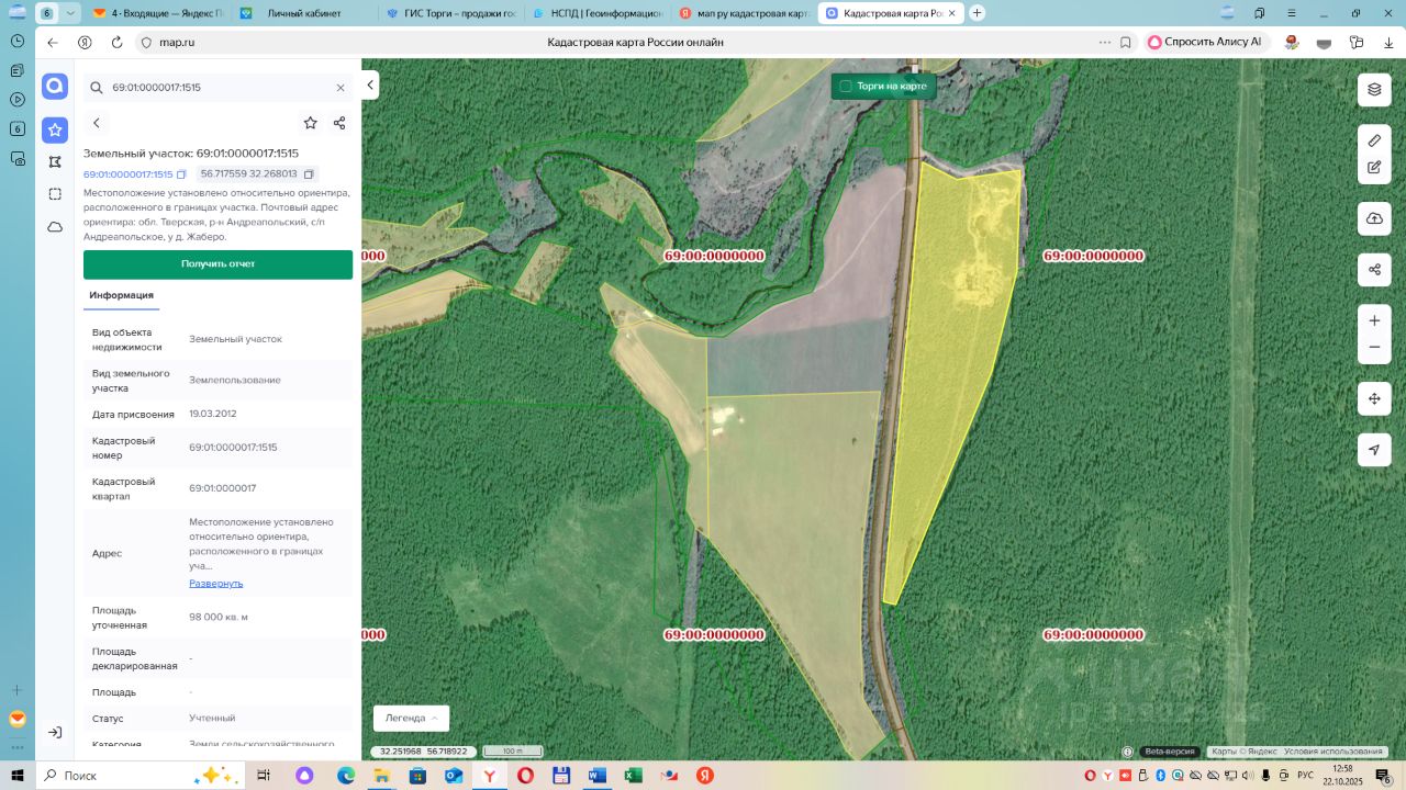 земельный участок с кадастровым номером 69:01:0000017:1515, площадью 98000 кв.м. Местоположение установлено относительно ориентира, расположенного в границах участка. Почтовый адрес ориентира: Тверская область, Андреапольский р-н, с/п Андреапольское, у д.Жаберо. Категория земель - земли сельскохозяйственного назначения. Разрешенное использование земельного участка для ведения сельского хозяйства. Ограничение прав и обременение земельного участка: не зарегистрировано.