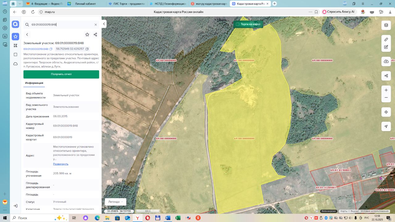 земельный участок с кадастровым номером 69:01:0000019:848, площадью 205999 кв.м. Местоположение установлено относительно ориентира, расположенного за пределами участка. Почтовый адрес ориентира: Тверская область, Андреапольский р-н, с/п Луговское, в близи д.Луги. Категория земель - земли сельскохозяйственного назначения. Разрешенное использование земельного участка для ведения крестьянского(фермерского) хозяйства. Ограничение прав и обременение земельного участка: ограничения прав на земельный участок, предусмотренные статьей 56 Земельного кодекса Российской Федерации.