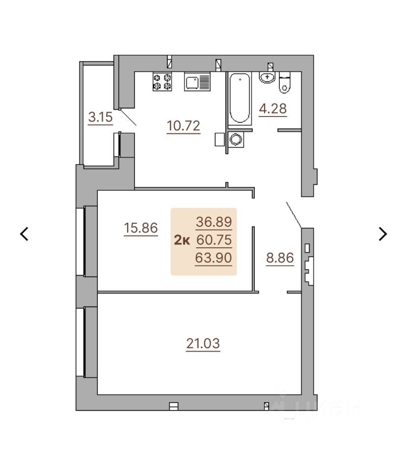 Общая площадь квартиры 64 м2, изолированные комнаты 16/21м2 кухня 11 м2.