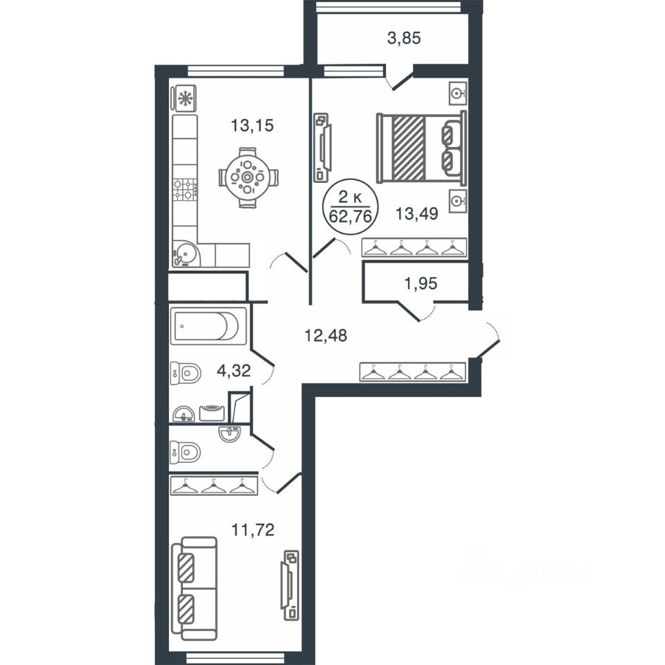Общая площадь62,76 м²